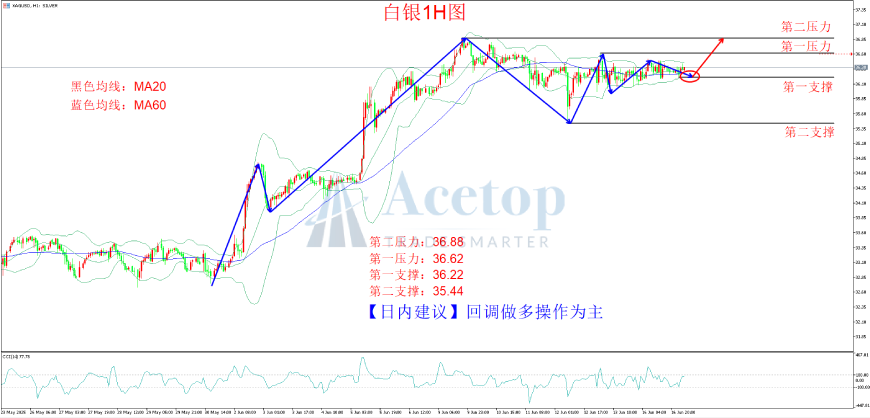 上图为白银1小时图。图中可见价格前期走上行趋势,短期虽有回落,但由于前期突破了历史级别高点,且此次回落完成了对日线级别回调的试探,随后价格重新站上均线系统,均线系统MA20和MA60进入缠绕状态,且布林带进入缩口状态,预示行情有机会重新启动。CCI指标拐头向上进入超买区间附近,预示行情有机会进一步上行,故策略上建议顺多头趋势找支撑位埋伏多单思路。